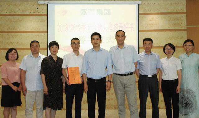 洪麟芝首先介紹了2018—2019季度合伙人考核重點指標的相關(guān)情況及其重要性。依據(jù)儀式程序,集團董事、副總經(jīng)理謝建強與各部門責(zé)任人鄭重地簽署了《合伙人考核責(zé)任書》,并立下“軍令狀”,以豪情滿懷的壯志迎接新的機遇和挑戰(zhàn)。